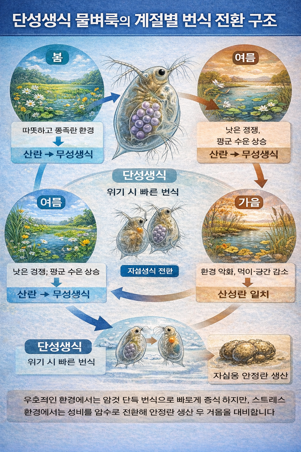 결국 물벼룩의 계절별 번식 전환은 단성생식이 단순한 예외적 현상이 아니라 자연 속에서 널리 활용되는 생존 전략임을 보여준다.